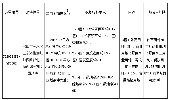 五、有意参与竞买者可于2025年11月7日后登录网上交易系统下载TD2025(SS)WP0062地块的《佛山市三水区国有建设用地使用权网上拍卖出让文件》。