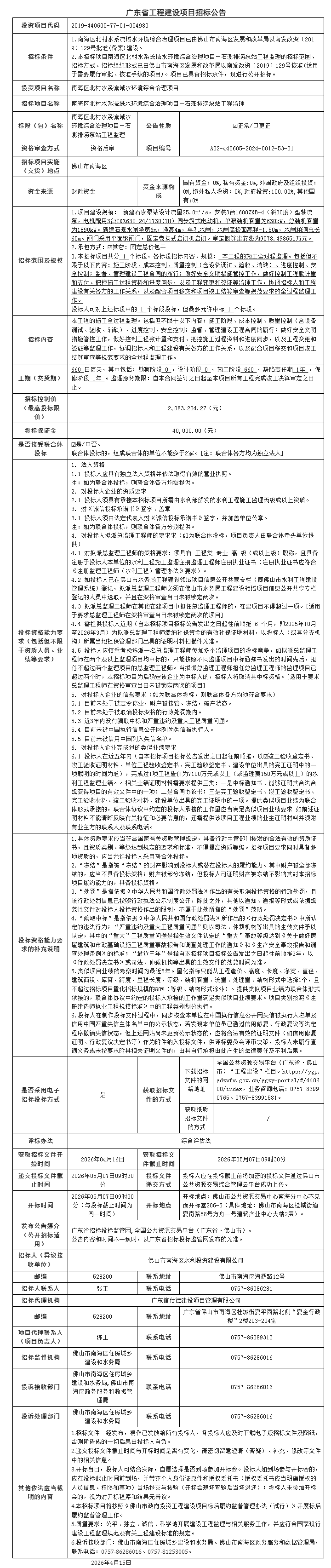南海区北村水系流域水环境综合治理项目—石澎排涝泵站工程监理招标公告