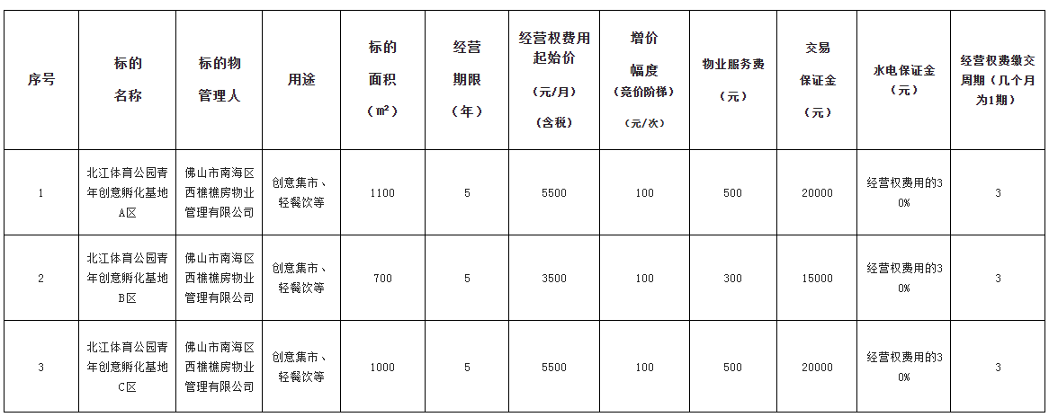 备注:(1)经营期限于2025年11月1日起开始计算,经营方可享受4个月建设期,建设期间只收取物业服务费,不收取经营权管理费。