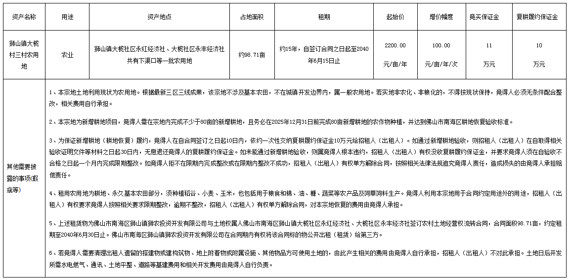 2.佛山市公共资源交易中心南海分中心通过佛山市资产交易网上交易系统及粤公平网站发布的项目信息(包括但不限于公告信息、交易文件、合同条款等)并不构成佛山市公共资源交易中心南海分中心对项目的任何交易建议。意向竞买人应不依赖于已披露的项目信息并自行对项目的相关情况进行必要的尽职调查和充分了解,对是否竞买该项目及项目成交后可能发生的费用和存在的风险自行作出充分评估,并独立承担所有风险。意向竞买人一经申请参加竞买,即视为知晓、认可项目现状,佛山市公共资源交易中心南海分中心对此不承担任何法律责任。