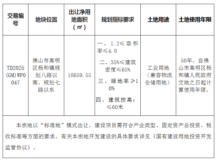 本块地其他规划建设要求按《高明区土地使用规划条件》(佛规明设函〔2025〕0079号)执行。