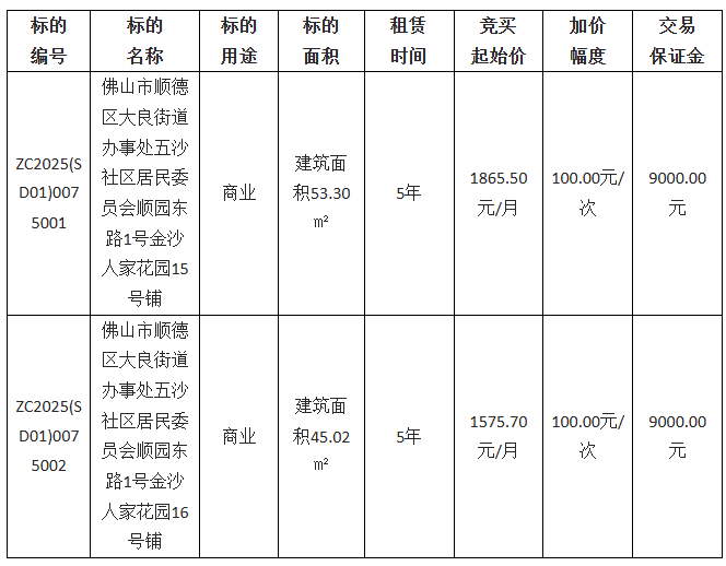 佛山市顺德区景良投资发展有限公司采用网上竞价方式出租位于佛山市顺德区大良街道办事处五沙社区居民委员会顺园东路1号金沙人家花园15号铺等2宗物业,欢迎符合资格的竞买人参与竞价。
