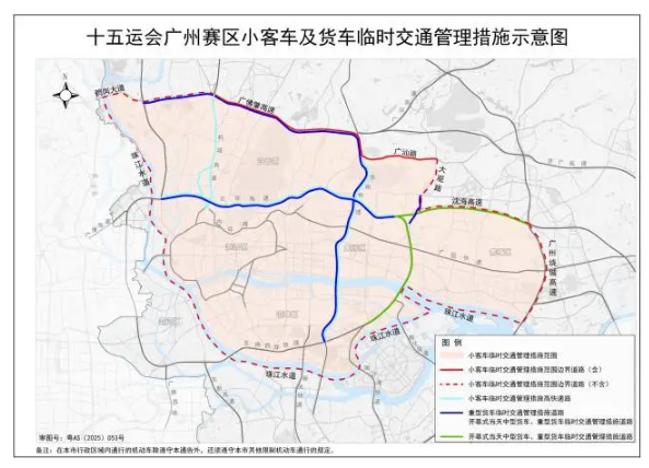 十五运会开幕式(11月9日)当天,在现有市区货车限行措施基础上,增加7时至24时禁止中型、重型货车通行广佛肇高速、华南快速干线、沈海高速广州支线北环段、大观路、沈海高速广州支线广深段、东南西环城市快速路的临时管理措施。