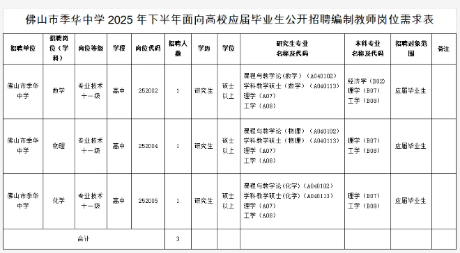 > 佛山市季华中学2025年下半年面向高校应届毕业生公开招聘编制教师公告