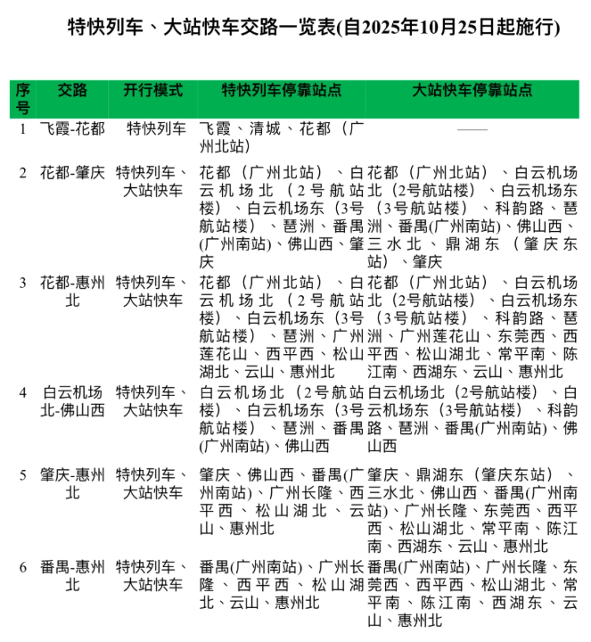 调整后,广东城际全天将开行“飞霞-竹料”“花都-东莞西”“白云机场北-佛山西”“肇庆-惠州北”等四条“站站停”交路,以及“飞霞-花都”“花都-肇庆”“花都-惠州北”“白云机场北-佛山西”“肇庆-惠州北”“番禺-惠州北”特快列车、大站快车交路,实现“线路-客流-运力”的精准匹配,构建更高效的珠三角城际网络。