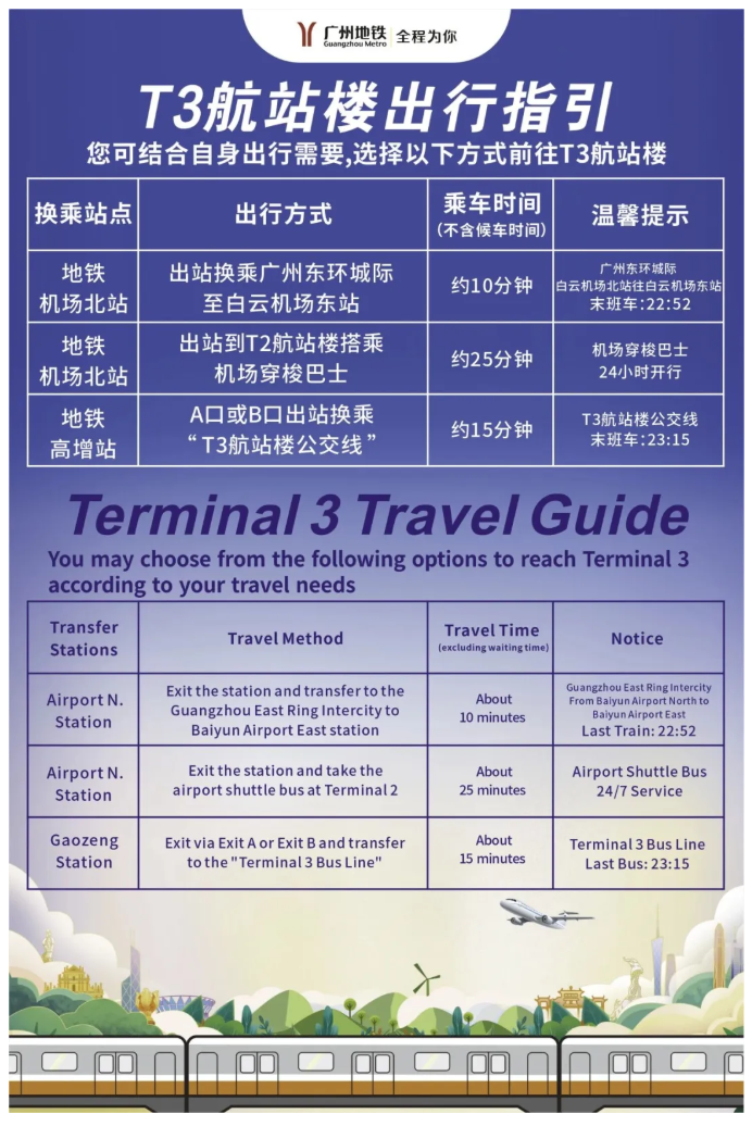 值得注意的是,由于广东城际的白云机场南站、白云机场北站和白云机场东站分别对应白云国际机场的1号、2号和3号航站楼,搭乘城际铁路到机场的旅客,务必留意购买机票时航空公司发送的手机短信或电子客票行程单,选择不同的城际站点下车前往相应的航站楼办理登机手续。