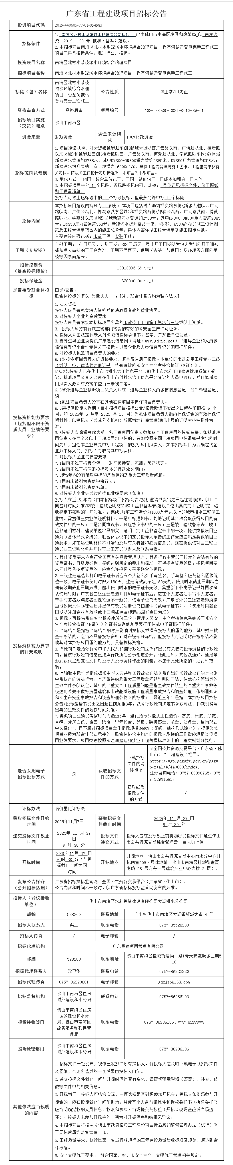 南海区北村水系流域水环境综合治理项目--香基河截污管网完善工程施工招标公告