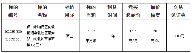 佛山市顺德区顺伦投资开发有限公司采用网上竞价方式出租位于佛山市顺德区伦教街道常教社区泰安路中伦教体育馆商铺(之三)公有物业使用权,欢迎符合资格的竞买人参与竞价。