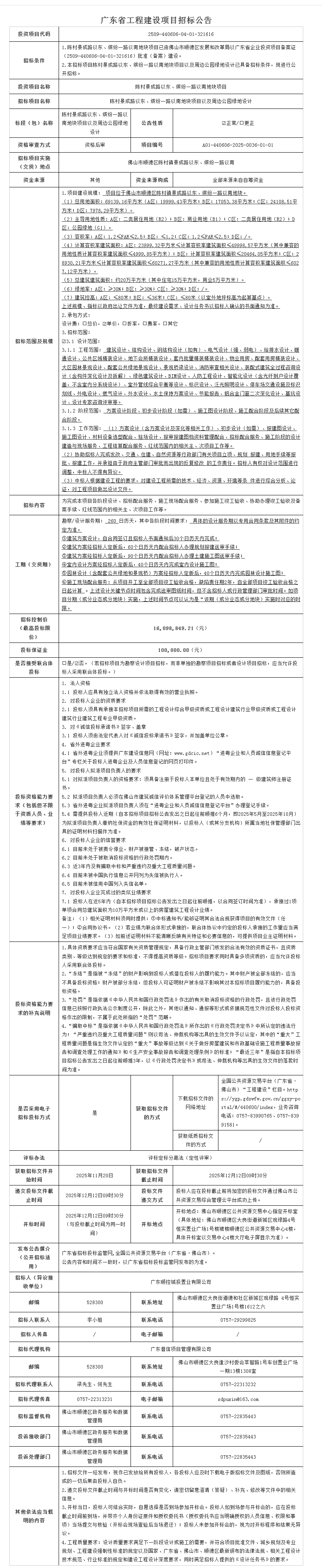 顺德陈村景成路以东、缤纷一路以南地块项目以及周边公园绿地设计招标公告