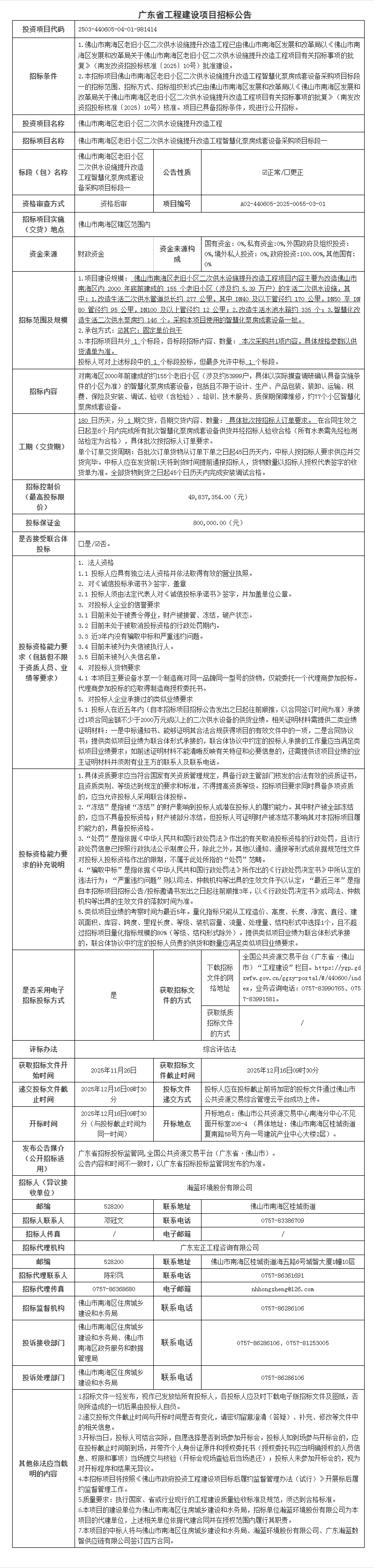 佛山市南海区老旧小区二次供水设施提升改造工程智慧化泵房成套设备采购项目标段二招标公告
