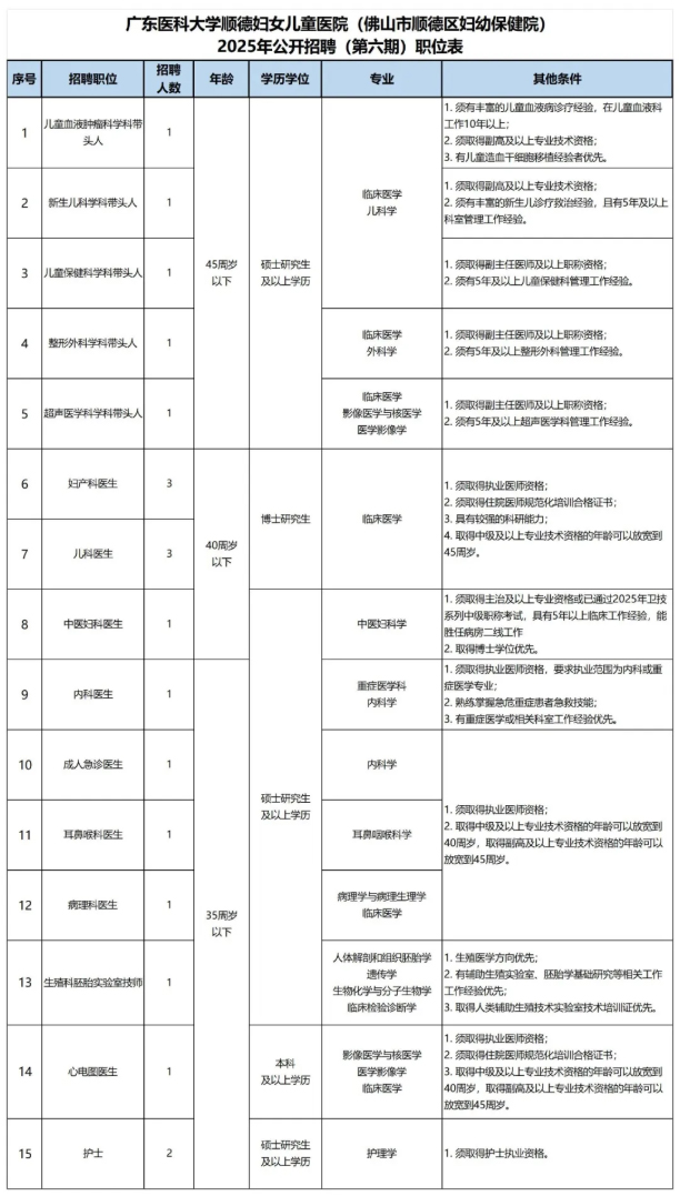 (五)岗位所需的其他条件见《广东医科大学顺德妇女儿童医院(佛山市顺德区妇幼保健院)2025年公开招聘职位表(第六期)》。
