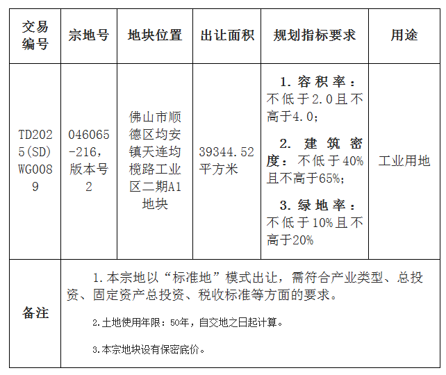概述:经佛山市人民政府批准,受佛山市自然资源局(以下称委托人)委托,本中心(以下称拍卖人)现采用网上拍卖方式出让以下地块的国有建设用地使用权......