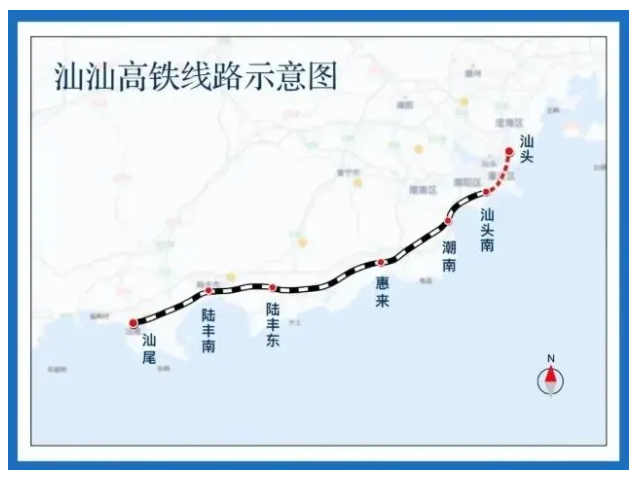 汕汕高铁起自汕头站,途经广东省汕头、揭阳、汕尾3市8区县,接入广州至汕尾高铁汕尾站。线路全长162公里,设计时速350公里,共设汕头、汕头南、潮南、惠来、陆丰东、陆丰南、汕尾7座车站。