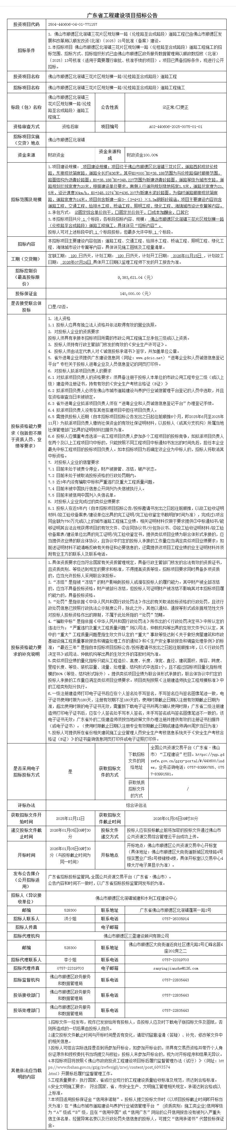 佛山市顺德区北滘镇三花片区规划横一路(伦桂路至合成路段)道路工程施工招标公告