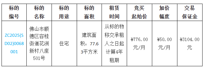 出租方采用网上竞价方式出租位于佛山市顺德区容桂街道花洲新村八座501号租赁权竞投,欢迎符合资格的竞买人参与竞价。