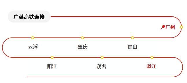 广湛高铁连接广州、佛山、肇庆、云浮、阳江、茂名、湛江等地市,线路全长401公里,设计时速350公里。