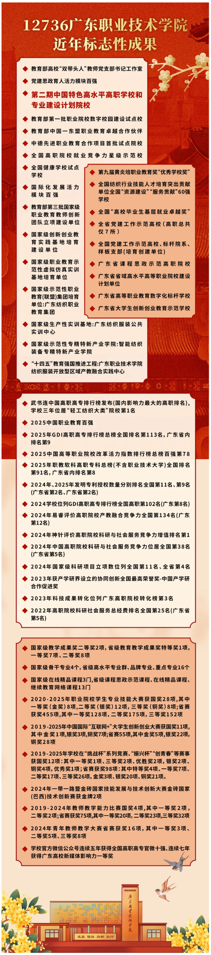 广东职业技术学院是由广东省人民政府主办的全日制普通高等职业院校,行政主管部门是广东省教育厅。学校现有禅城、高明、南海三个校区,校园总面积1200多亩,固定资产总值约超过13亿元,图书馆各类藏书达到120多万册。目前设有13院1部,即纺织学院、服装学院、轻工与材料学院、艺术设计学院、外语外贸学院、信息工程学院、商学院、智能制造学院、汽车与交通学院、教育学院、继续教育学院、马克思主义学院、创新创业学院、公共课教学部。学校开设了54个招生专业,校外实训基地314个,在校生超过2万3千人。武书连2020、2022和2023年三年中国高职高专专业大类排行榜上我校位居轻工纺织大类第一!2022年9月成为广东省省域高水平高等职业院校建设计划建设单位,2025年7月入选第二轮国家“双高建设计划”建设单位!