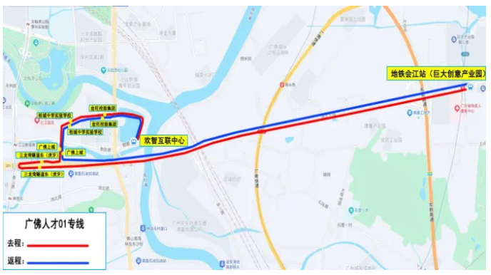 3月27日起,广佛人才01公交专线开通试运营。线路经过欢智互联中心、宏旺控股集团、广佛上城、三龙湾隧道东(虎牙)、地铁会江站(巨大创意产业园)等多个站点,运营服务时间为6:30至19:30,高峰时段发班间隔约30分钟。