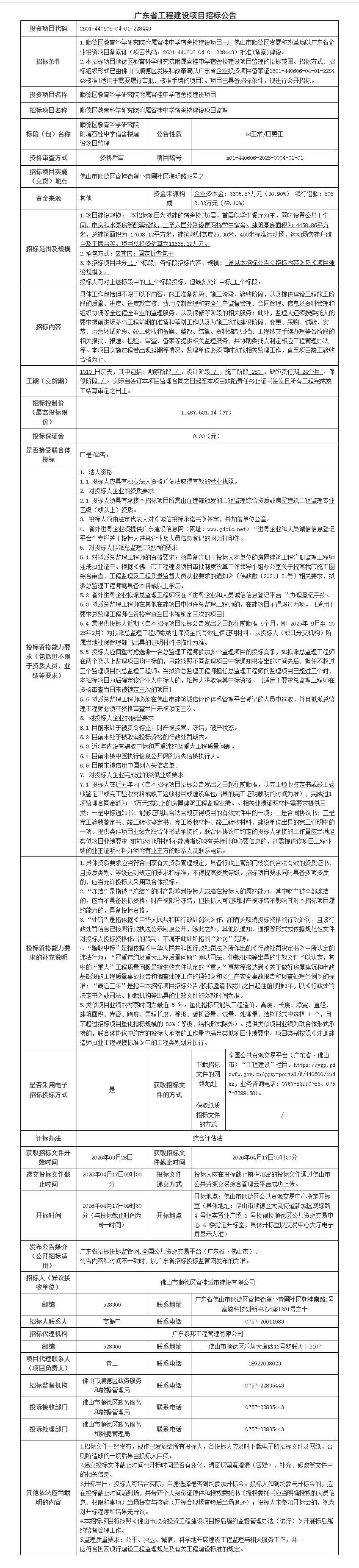 顺德陈村镇陈惠南纪念中学焕新扩建工程施工招标公告
