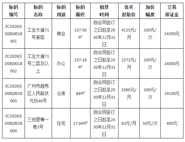 佛山市顺德区龙江镇峰江商贸投资有限公司采用网上竞价方式出租位于佛山市顺德区龙江镇工业大道71号首层等4宗物业使用权,欢迎符合资格的竞买人参与竞价。