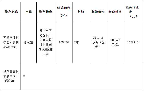 2.佛山市公共资源交易中心南海分中心通过佛山市资产交易网上交易系统及粤公平网站发布的项目信息(包括但不限于公告信息、交易文件、合同条款等)并不构成佛山市公共资源交易中心南海分中心对项目的任何交易建议。意向竞买人应不依赖于已披露的项目信息并自行对项目的相关情况进行必要的尽职调查和充分了解,对是否竞买该项目及项目成交后可能发生的费用和存在的风险自行作出充分评估,并独立承担所有风险。意向竞买人一经申请参加竞买,即视为知晓、认可项目现状,佛山市公共资源交易中心南海分中心对此不承担任何法律责任。