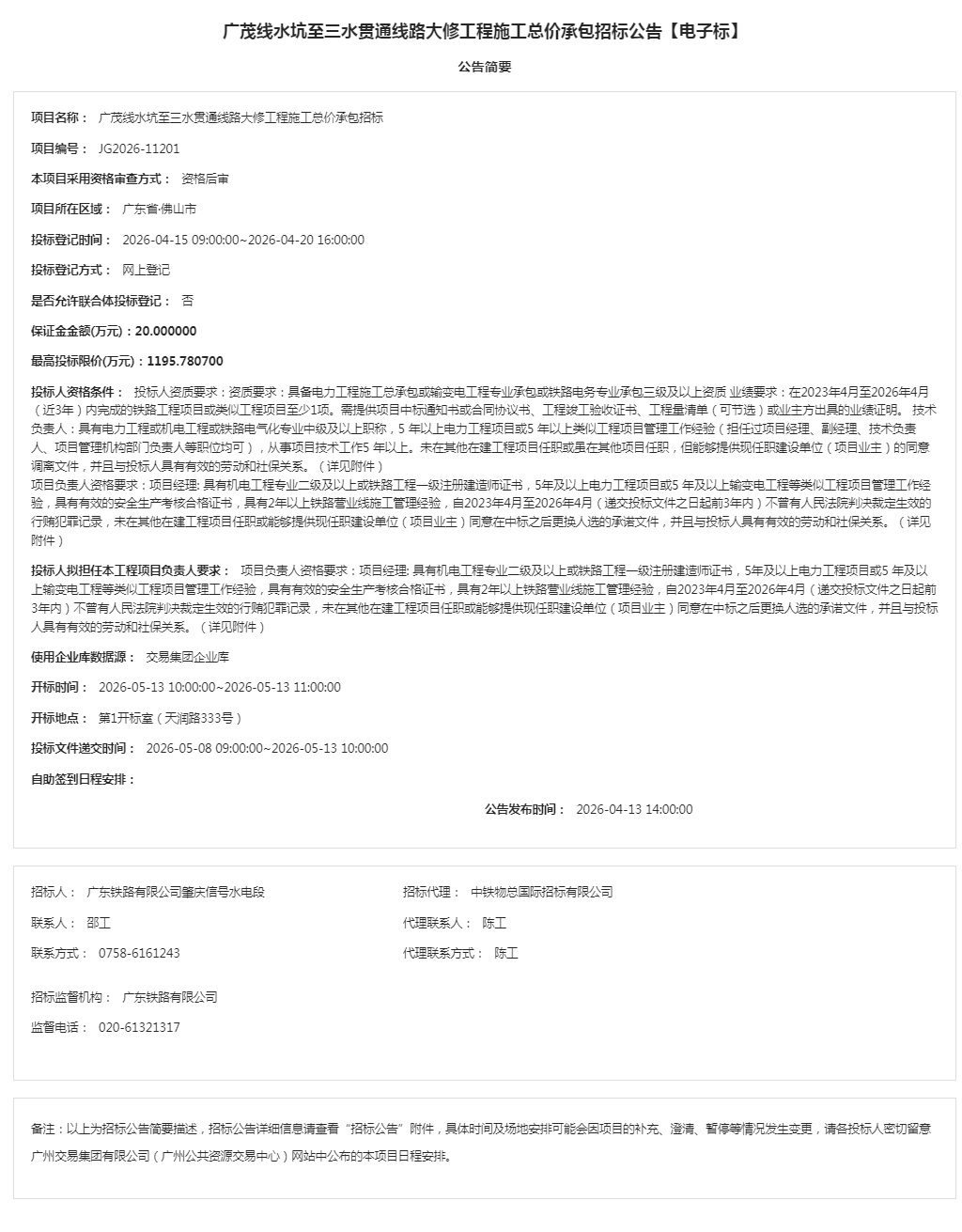 广茂线水坑至三水贯通线路大修工程施工总价承包招标公告