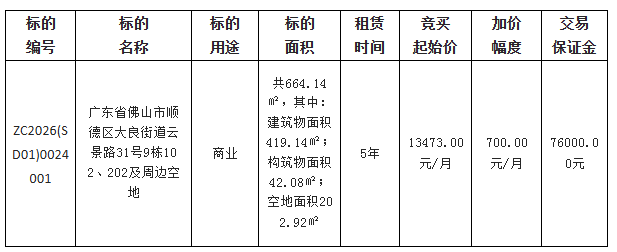 佛山市顺德区大良德良物业管理有限公司采用网上竞价方式出租位于佛山市顺德区大良街道云景路31号9栋102、202及周边空地物业,欢迎符合资格的竞买人参与竞价。