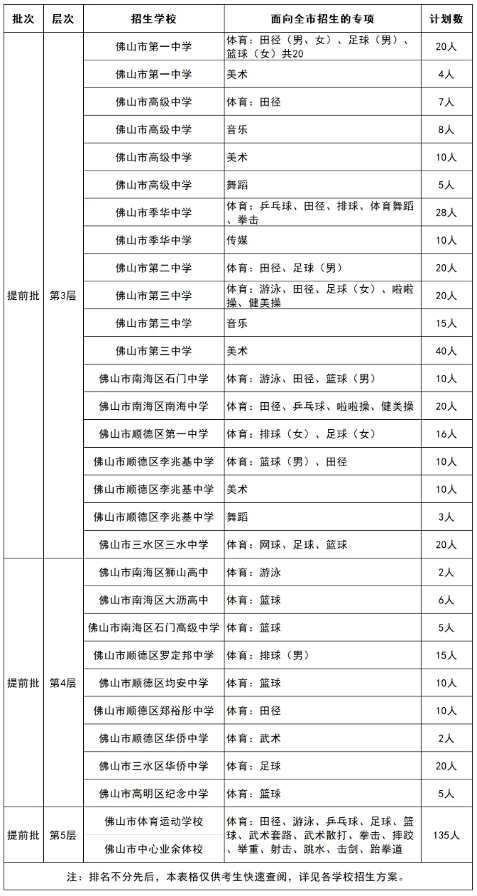 提前批普通高中自主招生方案(提前批第2层)和其他面向全市招生艺术类计划(提前批第4层)另行通知。第二批面向区内招收体育、艺术特长生信息可留意各区通知。
