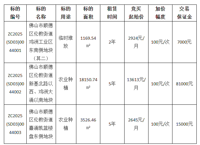 佛山市顺德区伦安安防技术有限公司采用网上竞价方式出租位于佛山市顺德区伦教街道鸡洲工业区东南侧地块(其二)等三宗地块使用权,欢迎符合资格的竞买人参与竞价。