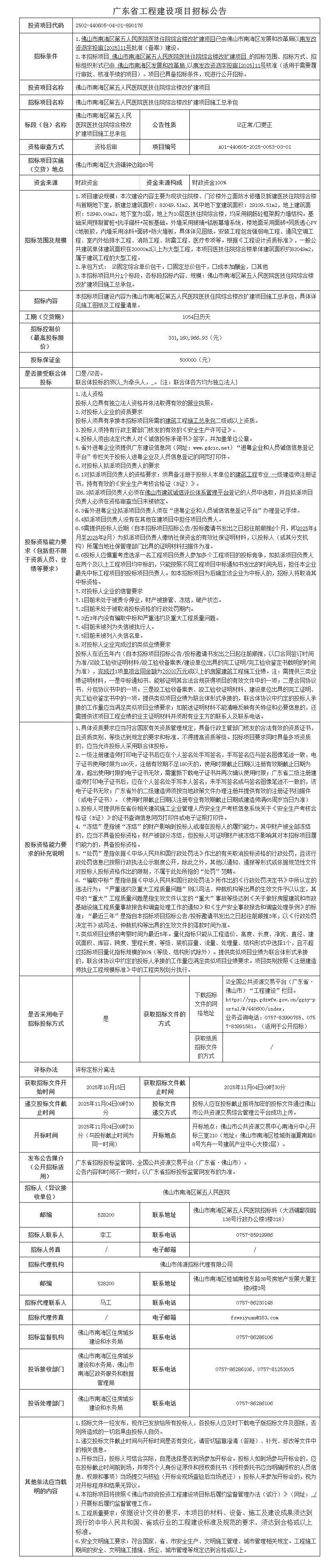 佛山市南海区第五人民医院医技住院综合楼改扩建项目施工总承包