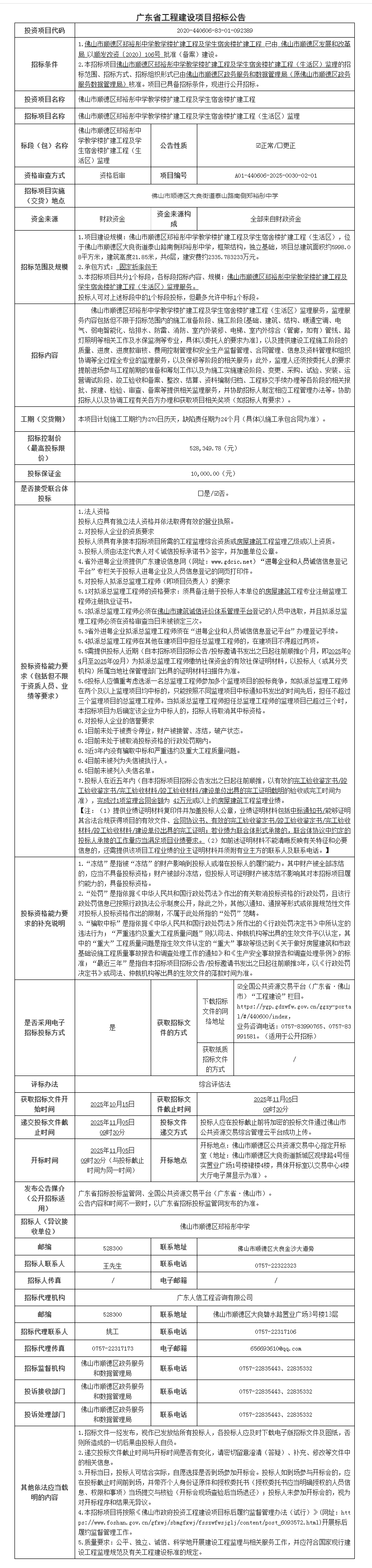佛山市顺德区郑裕彤中学教学楼扩建工程及学生宿舍楼扩建工程(生活区)监理招标公告