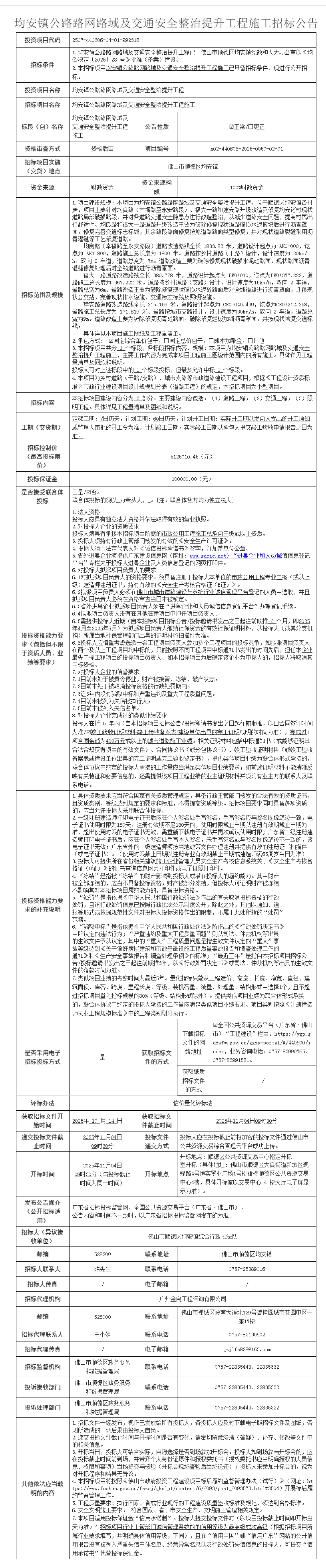 顺德均安镇公路路网路域及交通安全整治提升工程施工招标公告