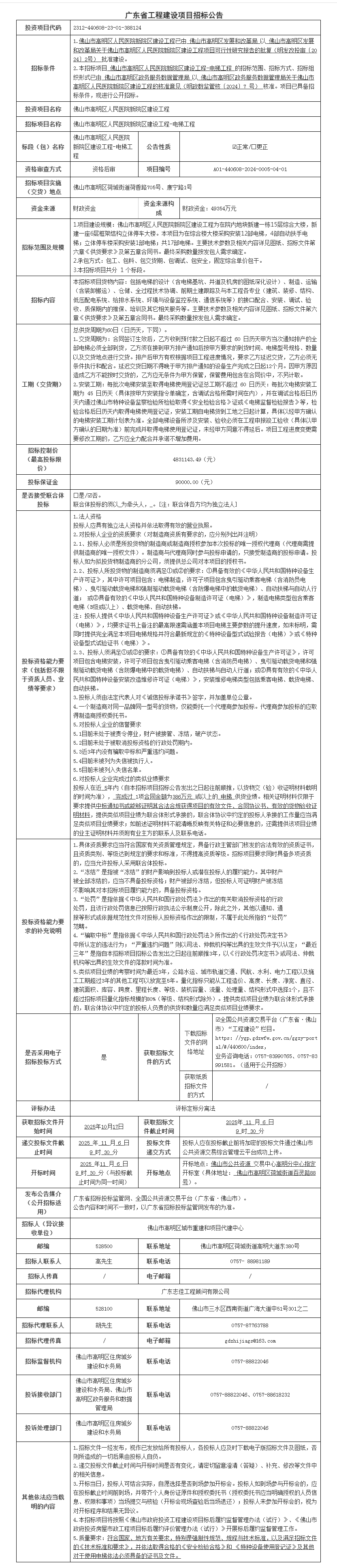 佛山市高明区人民医院新院区建设工程-电梯工程招标公告