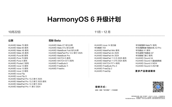 10月22日起,HarmonyOS 6面向首批90多款机型陆续开放升级。用户可以在系统设置软件更新和“我的华为”App首页直接申请升级尝鲜。加入公测,抢先体验新一代鸿蒙操作系统的强大魅力!更多信息可到华为智能生活馆·佛山禅城王府井咨询!