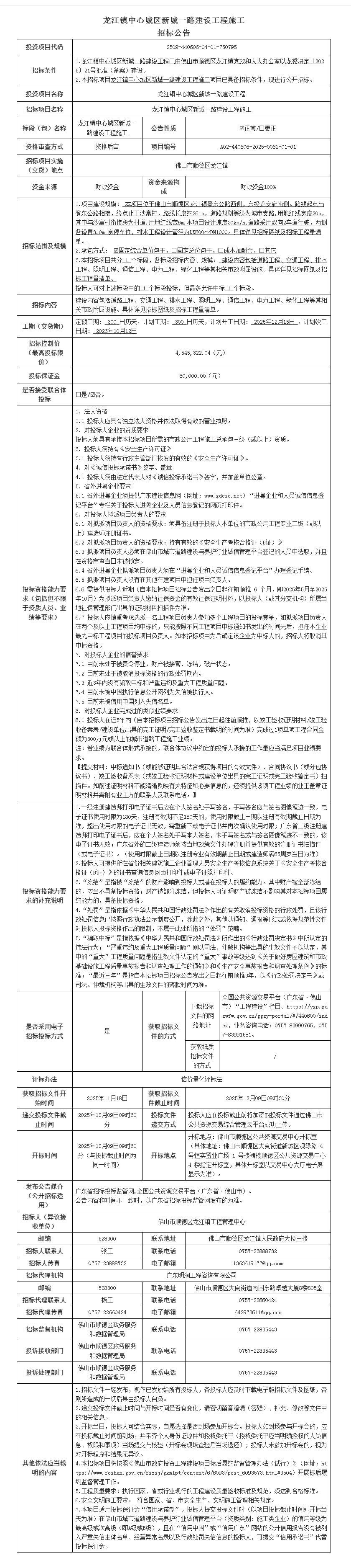 顺德龙江镇中心城区新城一路建设工程施工招标公告