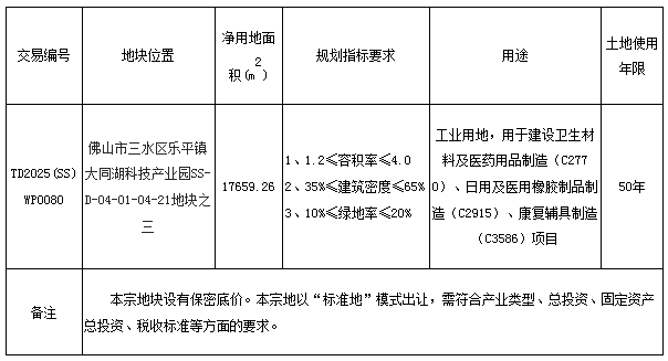 五、有意参与竞买者可于2025年12月4日后登录网上交易系统下载TD2025(SS)WP0080地块的《佛山市三水区国有建设用地使用权网上拍卖出让文件》。