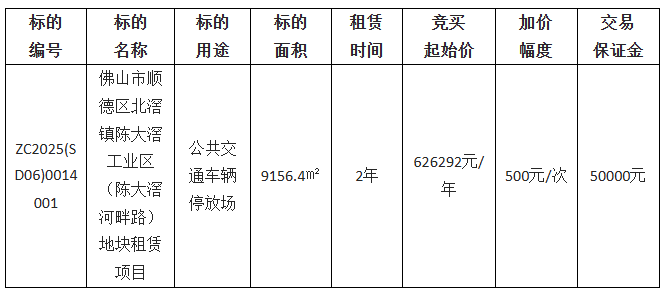 佛山市顺德区北滘镇土地发展中心采用网上竞价方式出租位于北滘镇陈大滘工业区的佛山市顺德区北滘镇陈大滘工业区(陈大滘河畔路)地块租赁项目使用权,欢迎符合资格的竞买人参与竞价。