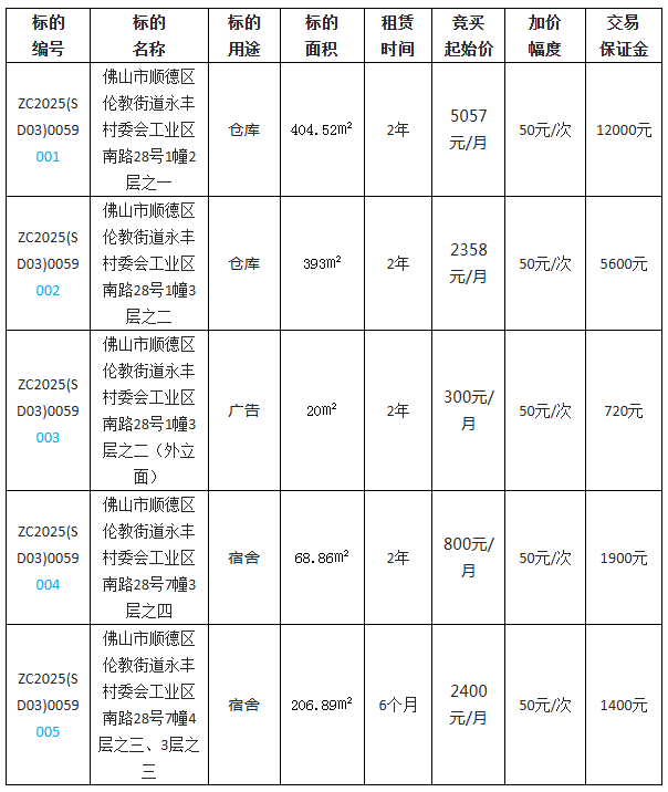 1.项目名称:佛山市顺德区伦教街道永丰村委会工业区南路28号1幢2层之一等五宗物业公开招租项目