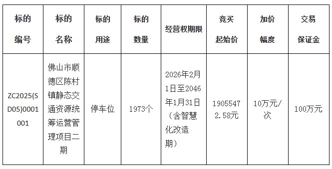广东人信工程咨询有限公司受佛山市顺德区陈村镇综合行政执法队委托采用网上竞价方式转让位于佛山市顺德区陈村镇内的佛山市顺德区陈村镇静态交通资源统筹运营管理项目二期经营权,欢迎符合资格的竞买人参与竞价。
