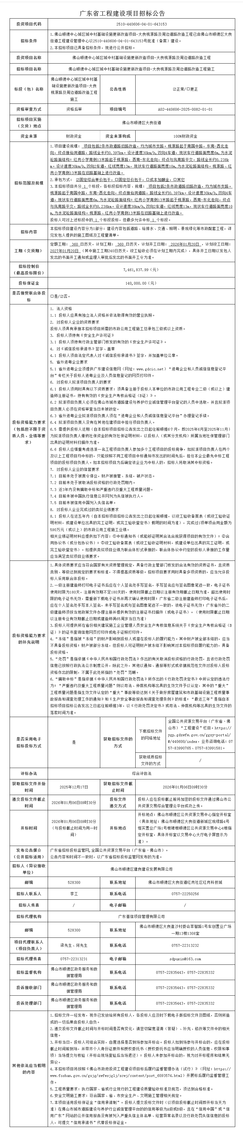 佛山顺德中心城区城中村基础设施更新改造项目-大良桃源路及周边道路改造工程施工招标公告