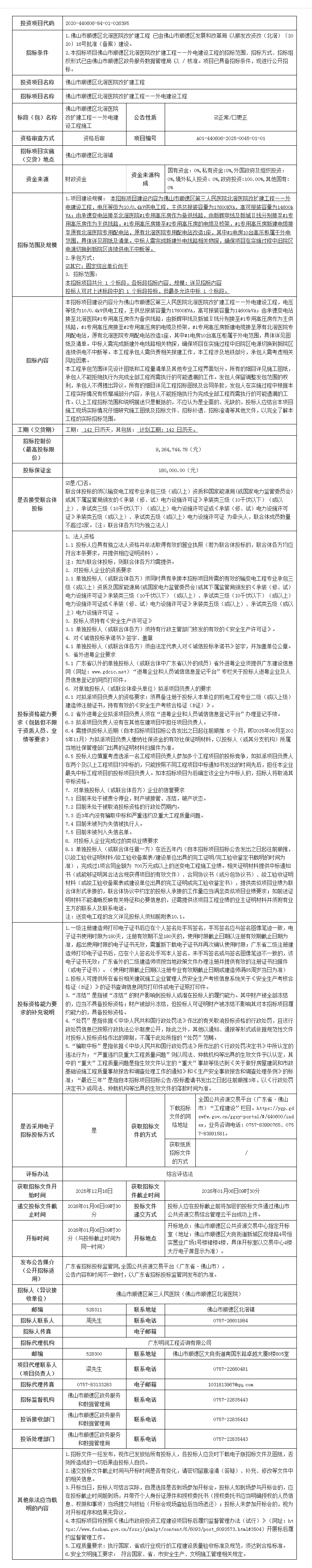 本招标项目佛山市顺德区北滘医院改扩建工程——外电建设工程的招标范围、招标方式、招标组织形式已由佛山市顺德区政务服务数据管理局...[阅读全文]