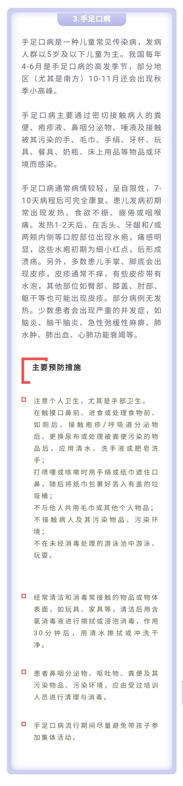 为平安健康地享受美丽的春天以及与亲友欢聚的美好时光,中国疾病预防控制中心温馨提示:今年五一假日期间,要重点做好新冠肺炎、诺如病毒肠炎、手足口病、蜱传播疾病、动物传播疾病和食物中毒的预防与防范。