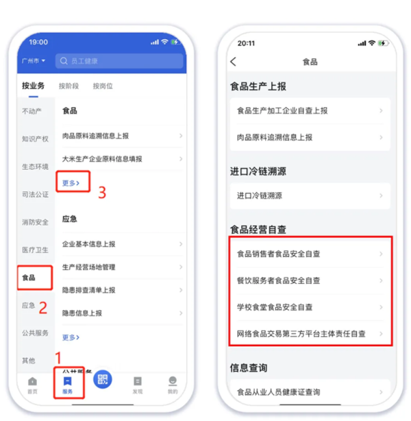 在粤商通APP首页点击[服务],选择[食品]类目,点击[更多],选择“食品经营自查”的具体经营类别进行填报,也可以通过搜索框输入服务名称进行搜索。