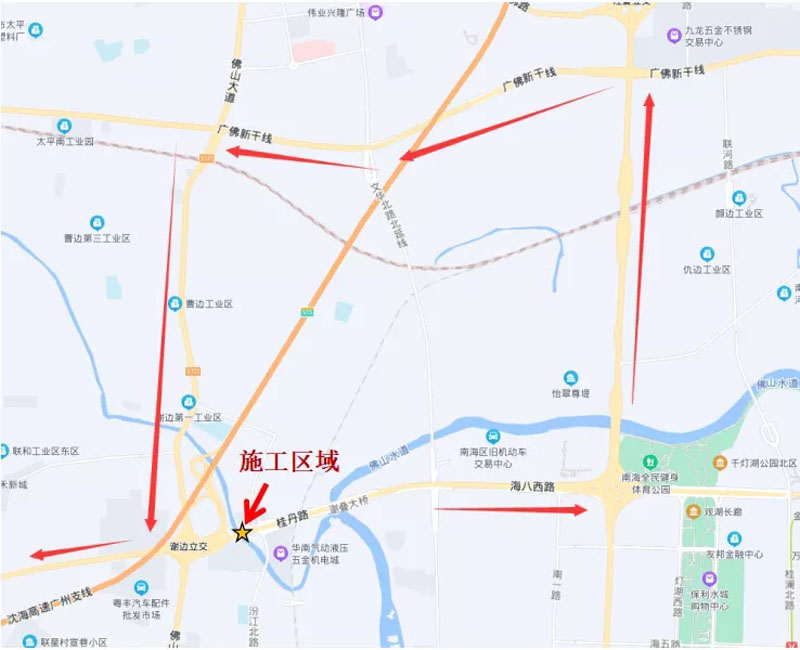 南海大道(季华路至魁奇路)占道施工,双向八车道缩窄为双向六车道,途径此路段车辆根据现场标志指示减速慢行或绕行周边的湖景路通行。
