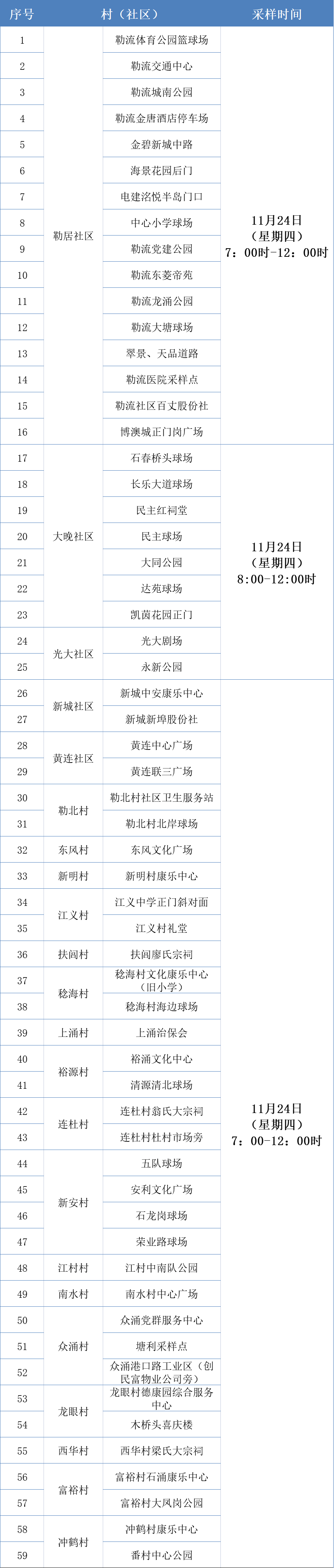 为方便有需要的市民就近进行核酸检测,北滘镇将于11月24日(星期四)在各村居设置黄码专门通道,以及在部分地点设置红码专区提供核酸检测服务,具体核酸检测安排如下: