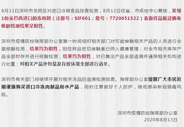 8月11日深圳市龙岗区对进口冷链食品排查检测,8月12日经省、市疾控中心复核,发现1份从巴西进口的冻鸡翅(注册号:SIF601;批号:7720051522)表面样品新冠病毒核酸检测结果呈阳性。