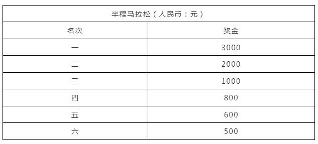 半程马拉松公开组男、女前八名以枪声成绩进行排名。奖金需缴纳20%的个人所得税,由组委会代收代缴,具体奖金如下表: