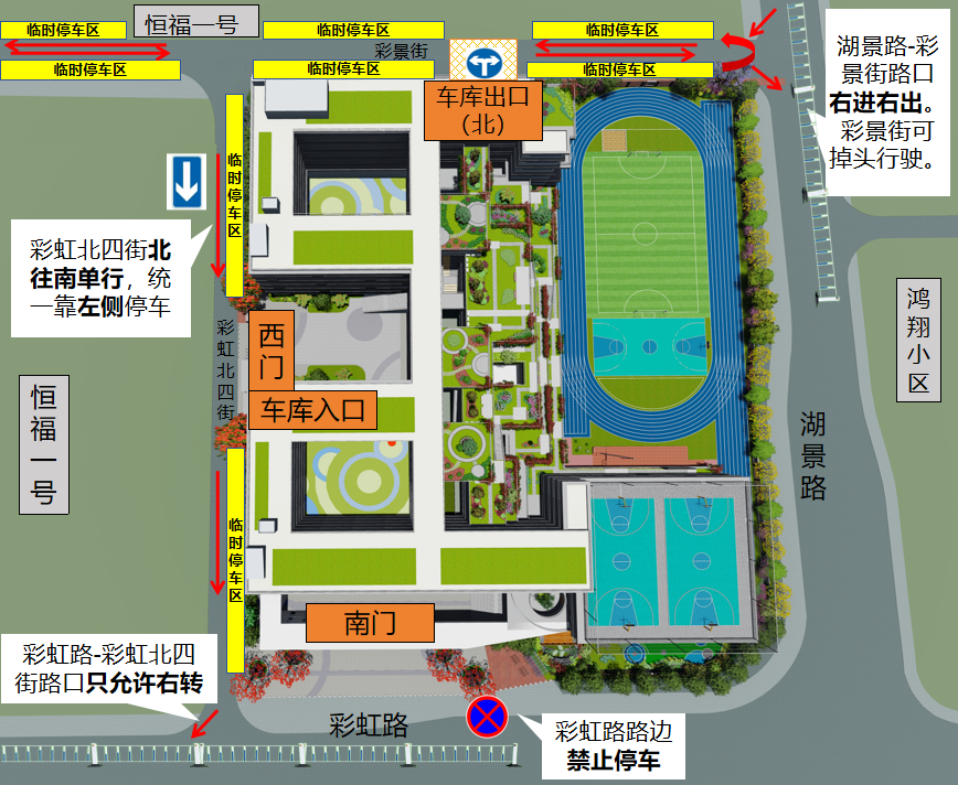 华英附小南门彩虹路路边禁止停车,如有停车需求应停放在彩虹北四街东侧或彩景街两侧。交通路线如下: