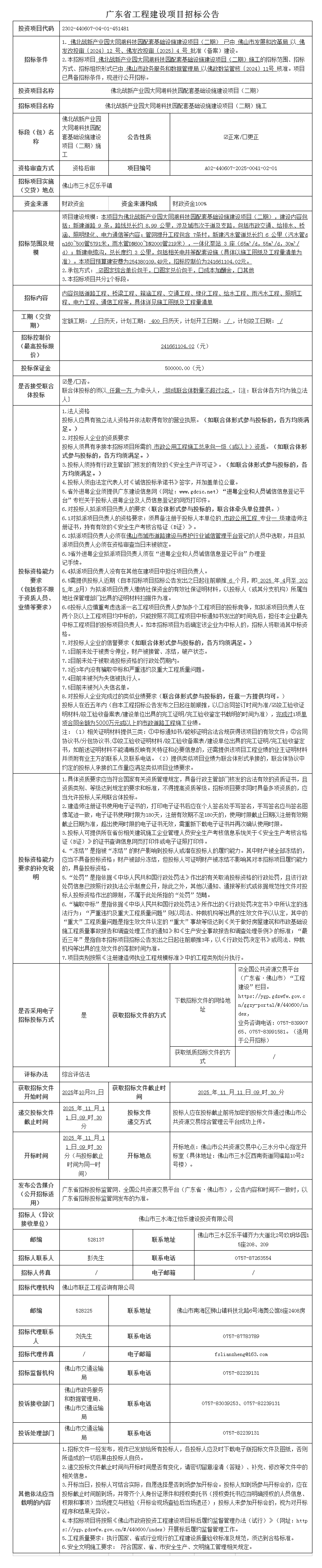 佛北战新产业园大同湖科技园配套基础设施建设项目(二期)施工招标公告
