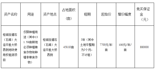 概述:标的物仅限种植用途(其中131.59亩耕地必须种植粮食作物和种植非粮食作物)。禁止用作违法经营及危险易燃易爆行业、废旧金属等回收行业,不得经营饮食行业......